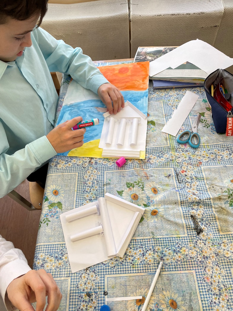 Вторая группа учащихся из альбомного листа сделает фасад храма с колоннами. Разместите макет вашего храма в подходящем месте нарисованного вами пейзажа.