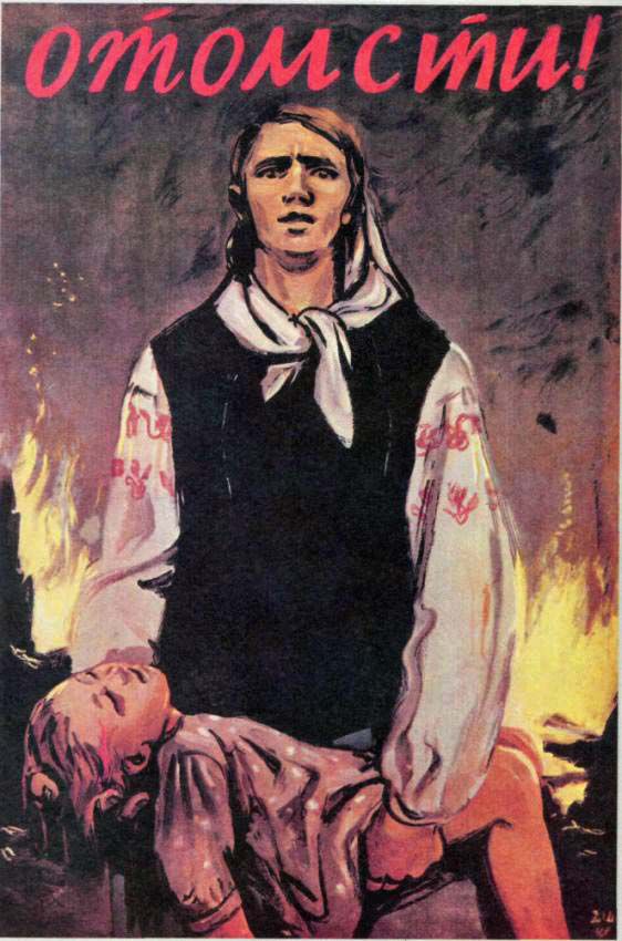 С плаката художника Дементия Алексеевича Шмаринова «Отомсти» на зрителя смотрит женщина. Она стоит на пепелище, неподвижная и страшная в своем горе. На ее опущенных руках — тело зверски убитой девочки. В широко раскрытых, наполненных слезами глазах матери не только страдание, но и требование — отомсти!