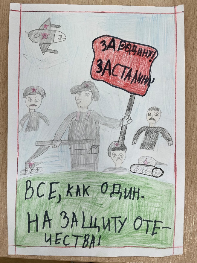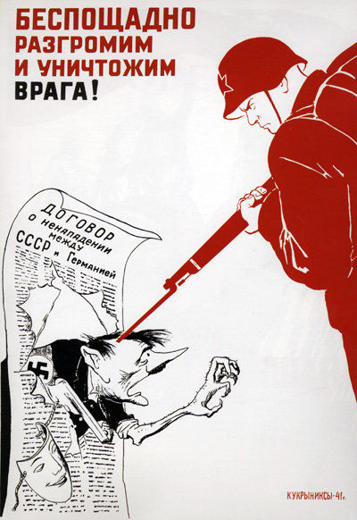 Уже на второй день войны уже появился плакат «Беспощадно разгромим и уничтожим врага!» творческого коллектива советских художников-графиков и живописцев «Кукрыниксов». Название творческого коллектива «Кукрыниксы» составлен из первых слогов фамилий Михаил Куприянова (1903–1991) и ПорфирийКрылова (1902–1990) а также первых трёх букв имени и первой буквы фамилии Николая Соколова (1903–2000).