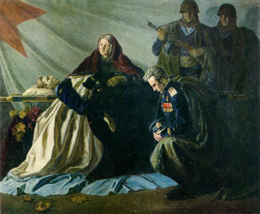 О стойкости и мужестве советских людей, о героизме и бесстрашии советской женщины-матери рассказал художник С. В. Герасимов в картине «Мать партизана» (1943).