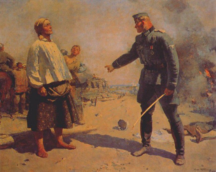 О зверствах фашистов, об их надругательстве над советскими людьми поведали художники А. А. Пластов в картине «Фашист пролетел» (1942)