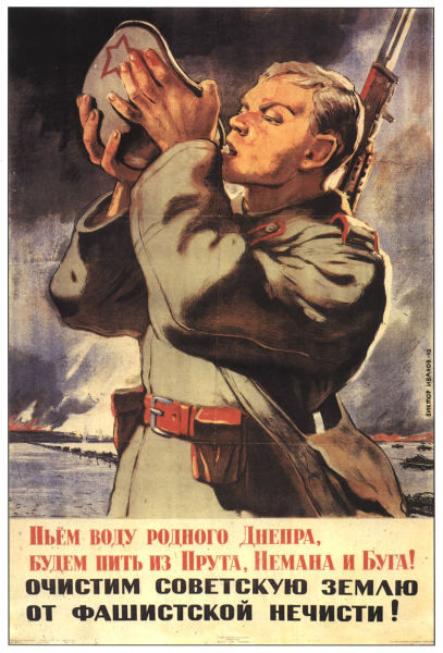 Участникам войны хорошо памятен плакат художника В. Иванова «Пьем воду родного Днепра». Пламенеет в зареве дымных пожарищ предрассветное небо, отраженное в темной и спокойной водной глади Днепра. Вдали виднеется только что наведенная саперами переправа. По ней нескончаемым потоком движутся на правый берег танки, автомашины. На переднем плане — крупная фигура советского воина. Он зачерпнул каской прохладную воду, бережно поднес ее ко рту и медленно пьет, наслаждаясь каждым глотком.