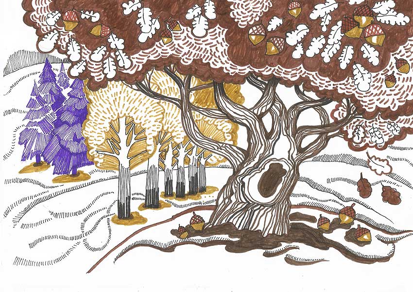 В основном декоративный пейзаж строится на упрощении деталей и акцентировании характерных линий и очертаний. Возможно и количественное изменение изображаемых объектов, если этого требует замысел художника.