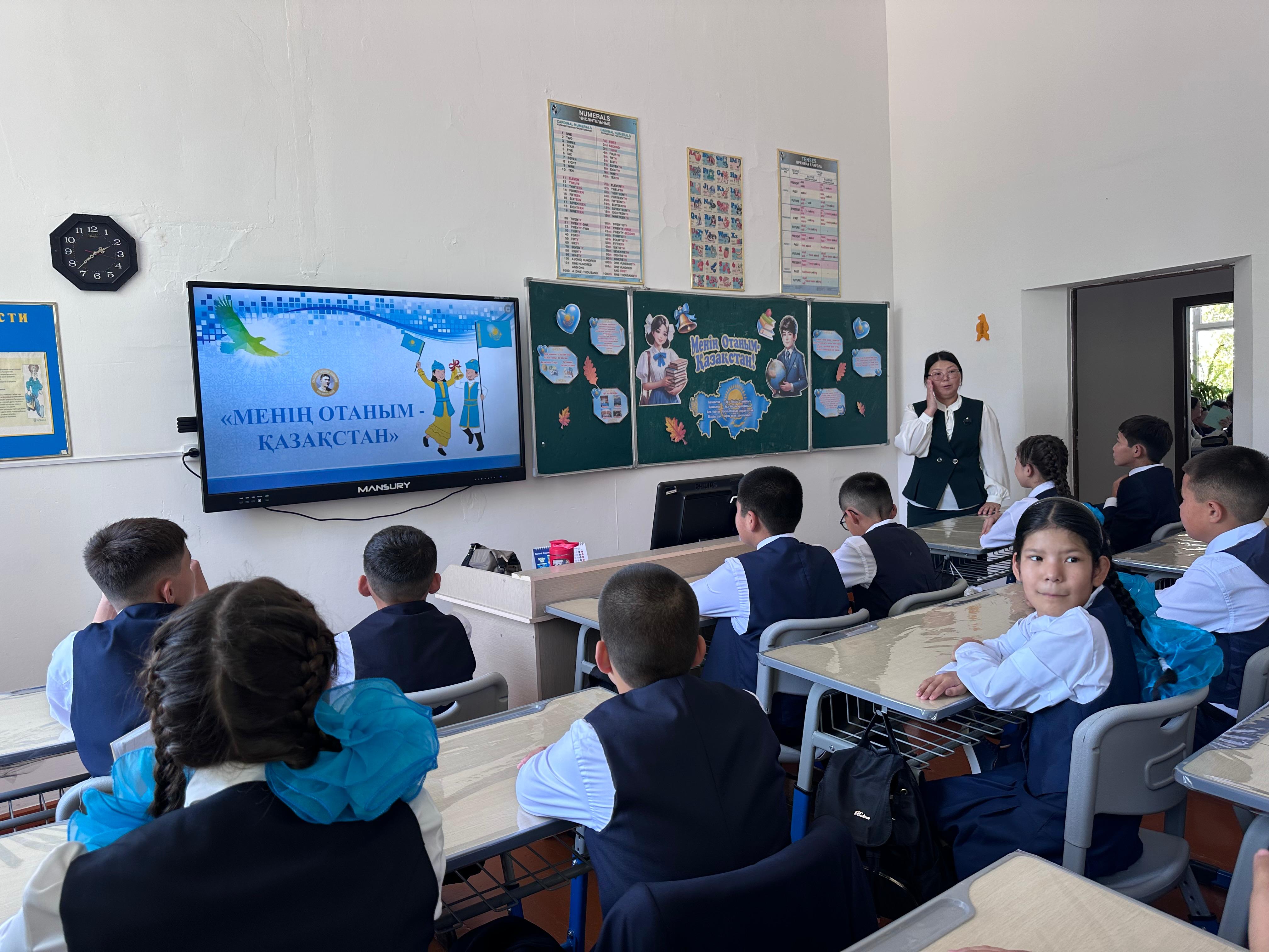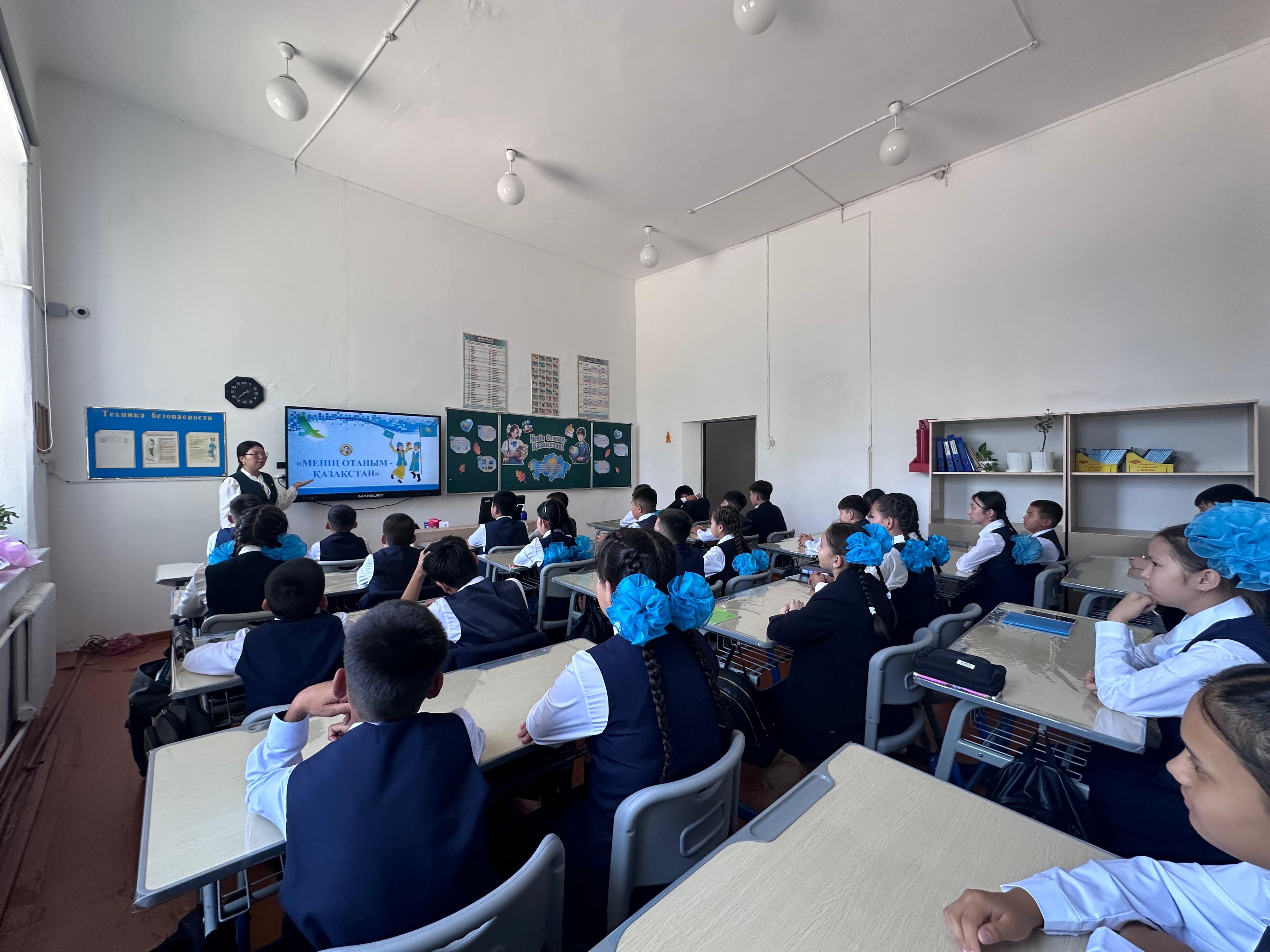 Сабақтың басы Сабақтың ортасы Сабақтың соңы | Сәлемдесу. Таныстыру. «Сен де бір кірпіш, дүниеге».... Жарайсыңдар, балалар, ендігі кезекте сендер осы Қазақстанымыздың болашағы өздеріңді таныстырып,осы мемлекетіміздің бір кірпіші ретінде қалануларың үшін бір бір маманық иесі болуларың керек, сол армандаған мамандықтарың мен өз есімдеріңді айтып таныстырып өтіңдер. .(Мысалы: Мен суретші Айдармын) Психологиялық ахуал туғызу. «Сәлем саған мектебім» әні Жаңа сабақ. Қазақстан Республикасының Президенті Қ. Тоқаев 2024 жылы Ұлттық құрылтайдың «Адал адам – Адал еңбек – Адал табыс» атты үшінші отырысында елімізді дамытуға қатысты маңызды бастамалар көтерді. Еліміздің болашақтағы негізгі сұлбасын «Әділетті Қазақстан – Адал азамат – Озық ойлы ұлт» деген үштаған ұғым арқылы сипаттады. Үштаған – бір-бірінен бастау алатын және өзара тығыз байланысты ұғымдар, ел ішінде заң мен тәртіпті қатаң сақтауды қамтамасыз етуді жүктеді. «Озық ойлы ұлт» идеясы балалар мен жастардың бойында білімге құштарлық, шығармашылық және инновациялық ойлау, кәсіби даму, бірлік пен ынтымақ құндылықтарды терең меңгеруді талап етеді. «Даналық ойдан дән ізде» айдары «Менің Отаным-Қазақстан!» бейнебаян қарау. Отан — елдің анасы, ел — ердің анасы. Туған жердей жер болмас, туған елдей ел болмас. Отанды сүю — от басынан басталады. Отан оттан да ыстық. Ел іші — алтын бесік. Пәлен жерде алтын бар, өз жеріңдей қайда бар. Ел-елдің бәрі жақсы, өз елің бәрінен де жақсы. Ел аралаған сыншы болады, тоғай аралаған үйші болады. Әркімнің өз жері —жұмақ. Ер — елінде, гүл —жерінде. Топтық жұмыс. Ұсынылған суреттер арқылы «Отанымды гүлдендірудегі менің үлесім» тақырыбында постер қорғайды. Қорытындылау. Халқымыздың бүгінгі уақытқа дейінгі жеткен жетістіктері біз үшін қымбат қазына. Еліміздің еркіндігін сақтар мықты ұрпақ, мықты азамат болу үшін тек қана жақсы тәртіп пен терең білім қажет етеді. Жолдарың ашық, жарқын болсын, Тәуелсіз елдің азаматтары Өз отанымыз Қазақстанды болашақта гүлденген, дамыған елдердің қатарына қосу үшін, үлгілі, тәртіпті болу, үлкенді сыйлау, іздену мен талаптану мақсатын ұстануымыз керек. Қатысушы ұстаз және аналарға сөз ұсыну. | Оқушылар көтеріңкі көңіл - күйде сәлемдесіп, өздерін таныстырады. Өзінің қалаған мамандығы туралы сипаттайды. лалар ән шырқап сыныпта жағымды ахуал қалыптастырады Слайдтар көрсету. Слайдтағы ғұламалар сөзін оқиды,мағынасын ашады. Бейнежазбаны көріп, білімдерін толықтырады. Ұсынылған мақал-мәтелдердің мағынасын ашып, өз ойын білдіреді. Берілген суреттер бойынша қандай өзінің алға қойған міндеті мен мақсаты туралы өз ойын ашық жеткізеді. | Сәлем-сөздің анасы (танысу айдары) https://www.youtube.com/watch?v=LQBmdC2RS1k |