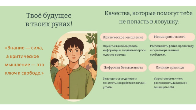 · Помните!Единственная надёжная защита - это критическое мышление, бдительность, доверительные отношения в коллективах, семье и готовность не проходить мимо чужой беды.