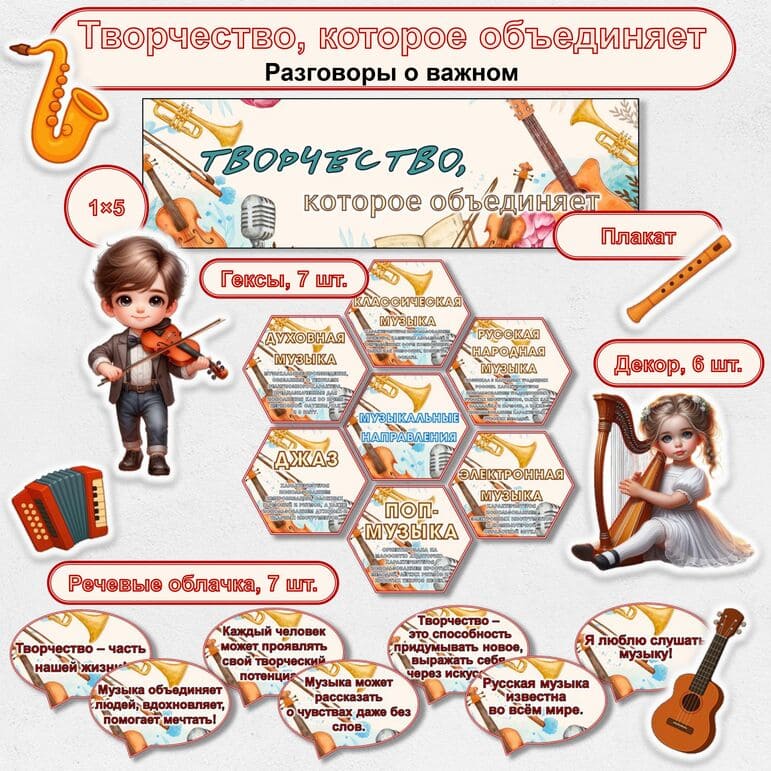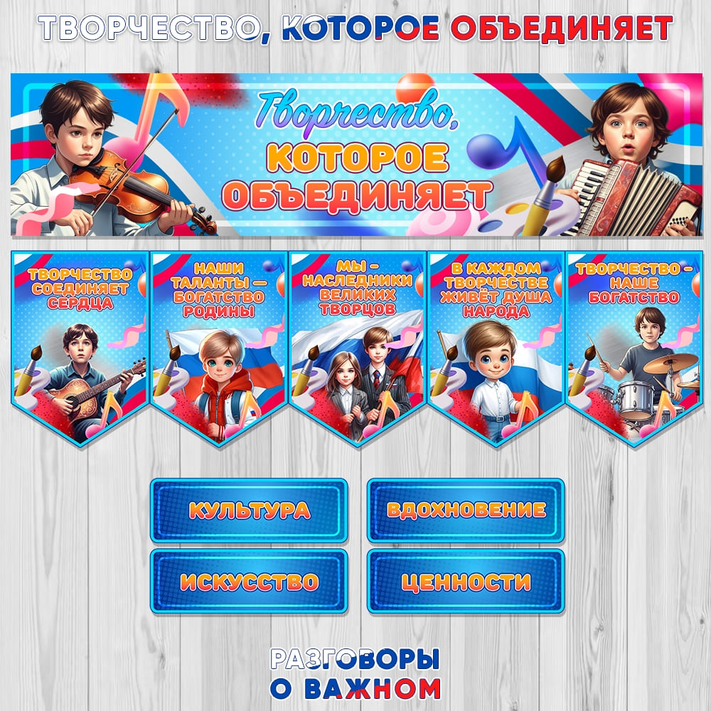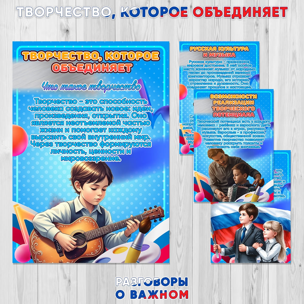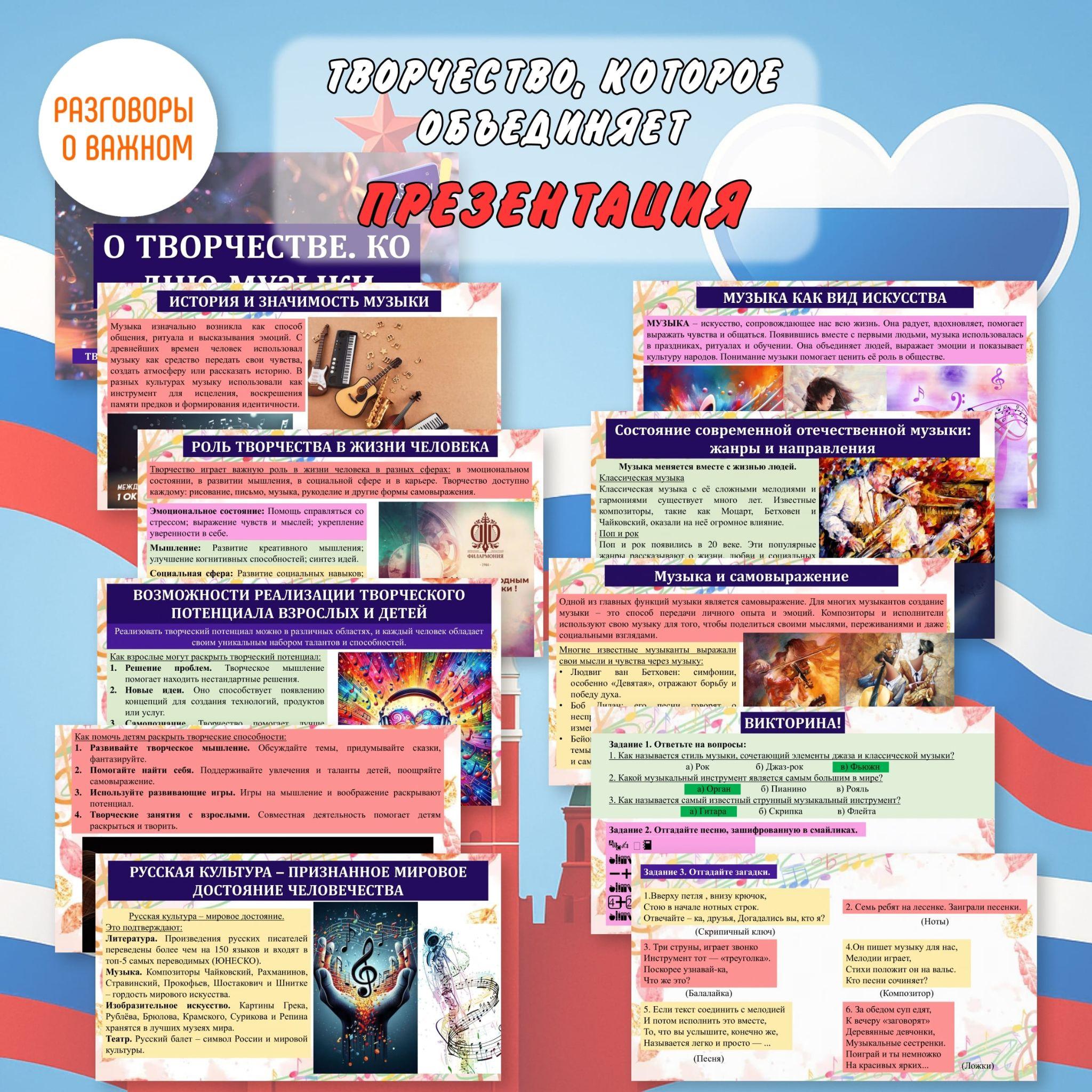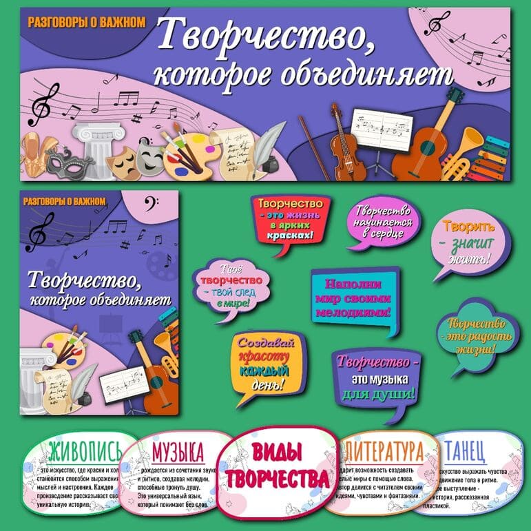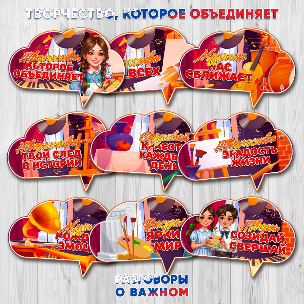 Все материалы для проведения классного часа в 1, 2, 3, 4, 5, 6, 7, 8, 9, 10, 11 классах и СПО 15 сентября 2025 года проект "Разговоры о важном" будет проведён на тему “Творчество, которое объединяет” с официального сайта razgovor.edsoo.ru разговорыоважном рф Сценарий, презентация, видеоролики, интерактивное задание, плакаты и другие материалы для проведения классного часа цикла внеурочной деятельности по ФГОС проекта «Разговоры о важном» в школе с 1 по 11 класс, а также в СПО.