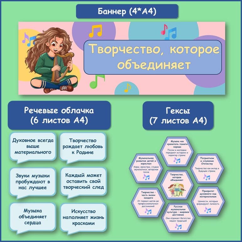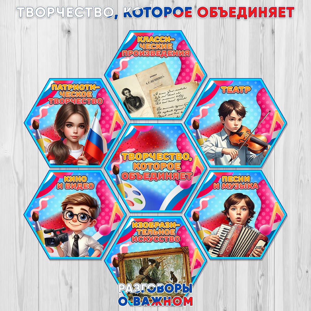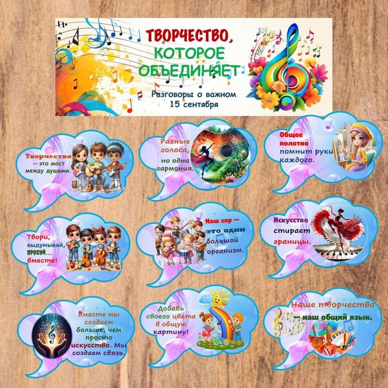 Все материалы для проведения классного часа в 1, 2, 3, 4, 5, 6, 7, 8, 9, 10, 11 классах и СПО 15 сентября 2025 года проект "Разговоры о важном" будет проведён на тему “Творчество, которое объединяет” с официального сайта razgovor.edsoo.ru разговорыоважном.рф