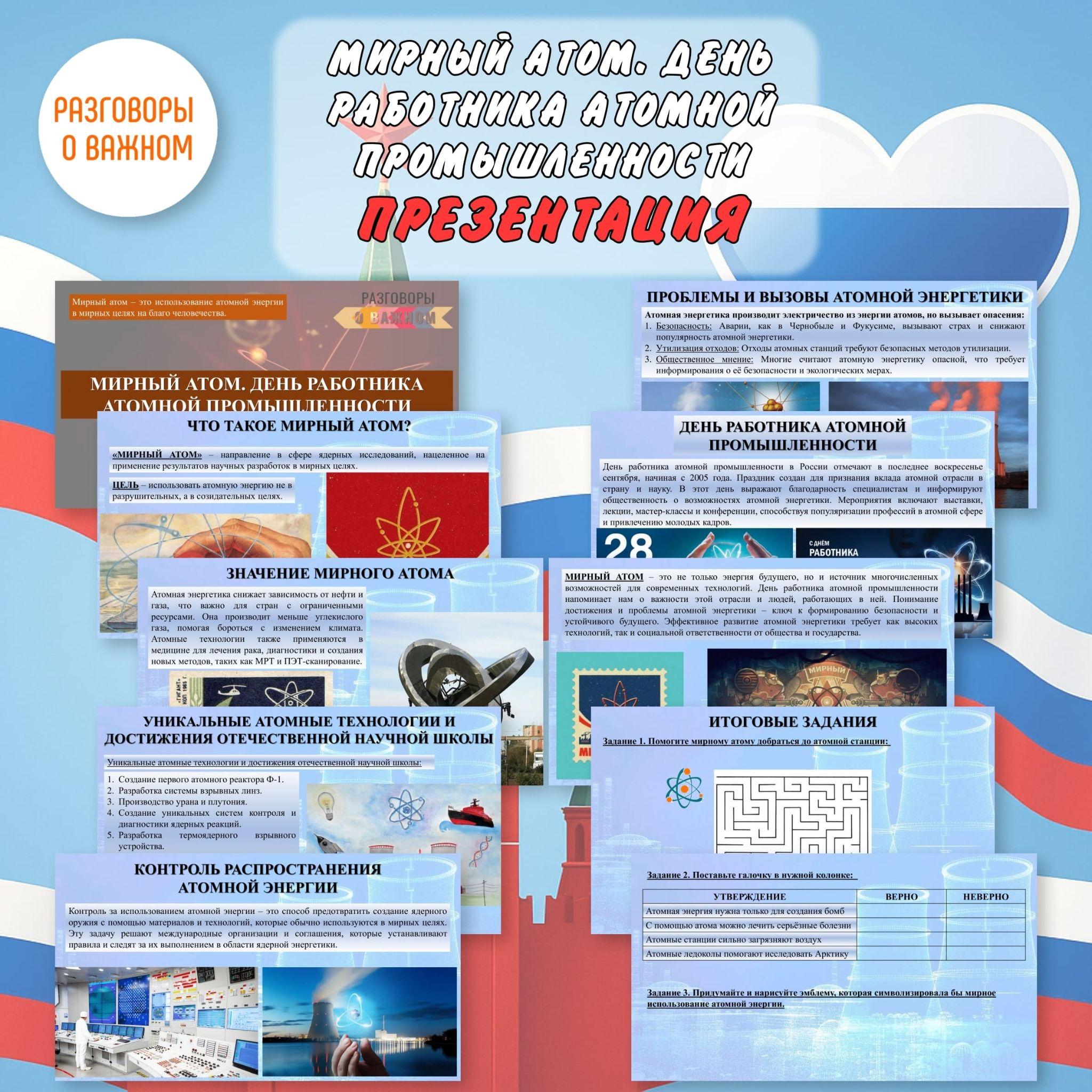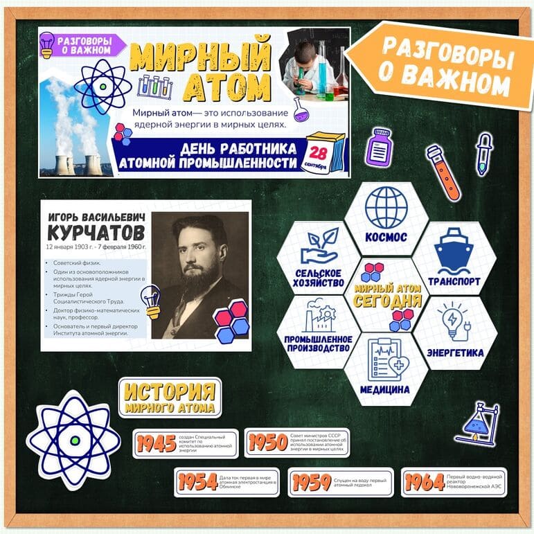 Все материалы для проведения классного часа в 1, 2, 3, 4, 5, 6, 7, 8, 9, 10, 11 классах и СПО 22 сентября 2025 года проект "Разговоры о важном" будет проведён на тему “Мирный атом. День работника атомной промышленности” с официального сайта razgovor.edsoo.ru разговорыоважном рф Сценарий, презентация, видеоролики, интерактивное задание, плакаты и другие материалы для проведения классного часа цикла внеурочной деятельности по ФГОС проекта «Разговоры о важном» в школе с 1 по 11 класс, а также в СПО.
