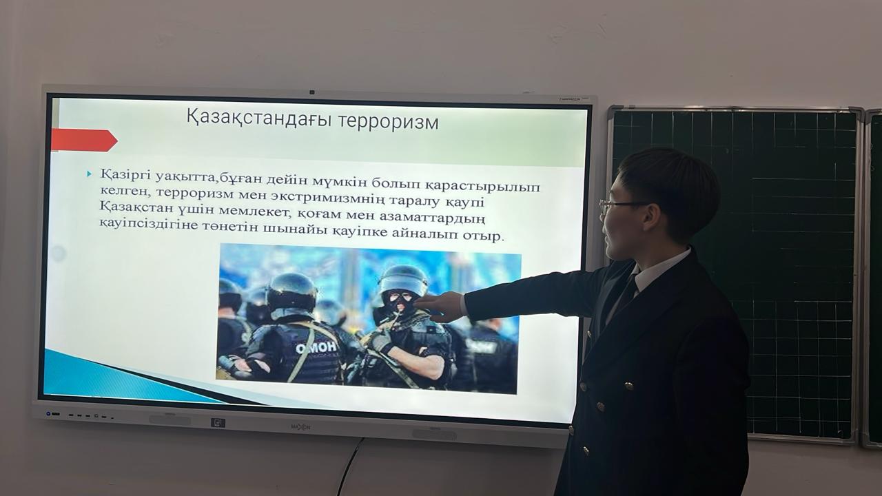 | Ұйымдастыру кезеңі (7 мин) | Бүгінгі тәрбие сағатын «Терроризм – қоғамға төнген қауіп» деп аталатын тақырыппен бастаймыз. Бұл тәрбие сағатында біз бейбіт өмірдің қадірін түсініп, елдің тыныштығы мен қауіпсіздігінің маңызын ой елегінен өткіземіз. Кіріспе өлең жолдары Жаса, елім, жаса нұрлы тірлікпен, Береке құт бірге келсін бірлікпен. Тыныштықты ту еткен Қазақстан, Өркендей бер үшінші мыңжылдықпен. Бейбіт болсын әр таңымыз, ашық аспан – Жерімізде достық мәңгі жасасын! Осымен бүгінгі тәрбие сағатымызды ашық деп жариялаймыз! | Оқушылар мұғаліммен амандасады,түгенделеді. Психологиялық ахуал Оқушылардың пікірі тыңдалады | Компьютер |