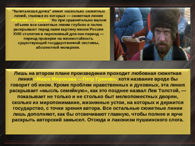 "Капитанская дочка" имеет несколько сюжетных линий, главная из которых — сюжетная линия«Пугачев — Гринев». Но при сравнительно малом объеме все сюжетные линии глубоко и полно раскрывают перед нами картину жизни России XVIII столетия в переломный для нее период — период проверки на жизнестойкость существующей государственной системы, абсолютной монархии.