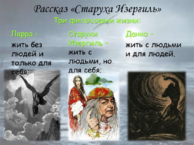 Ее равнодушие к тем, кому она отдавала свою любовь, поражает. Осуждая Ларру, Изергиль думает, что жизнь ее похожа на жизнь Данко, однако через портреты героев мы видим обратное: «…Он уже стал теперь как тень - пора! Он живет тысячи лет, солнце высушило его тело, кровь и кости, ветер распылил их…», - говорит о Ларре Изергиль, но почти те же черты видятся повествователю в ней самой.