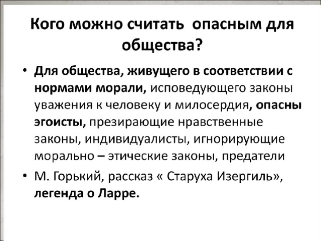 Несмотря на явную противоположность образов, в них есть общее - оба они являются людьми одного и того же мира - мира Изергиль, и оба противопоставлены обществу, один отвергает людей из презрения к ним, другой - сам попадает в положение отвергнутого. Автор и восхищается этими людьми, их силой и красотой, и в то же время он не согласен с их позицией. Изергиль рассказывает легенды, которые обрамляют ее жизнь, с одной стороны представляя высшую любовь к жизни, с другой - высшее презрение. Вся ее жизнь посвящена любви, но Изергиль уже забыла тех, кто еще совсем недавно занимал ее воображение.