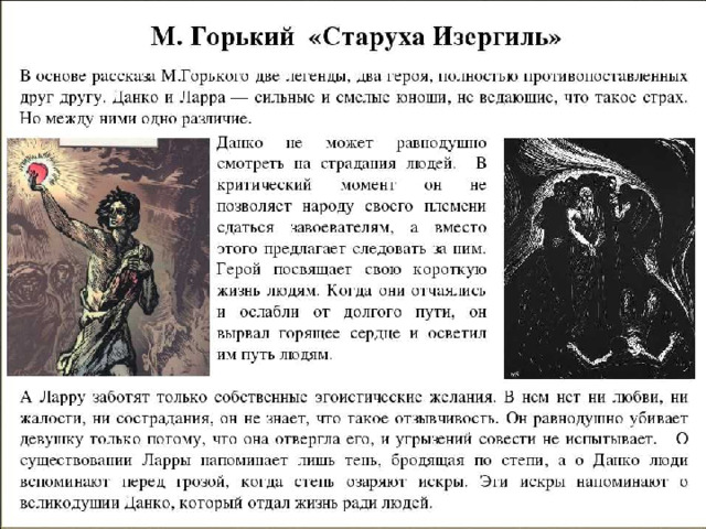 Характеры героев показаны на пределе: Ларра - крайний индивидуализм, Данко - крайнее самопожертвование.