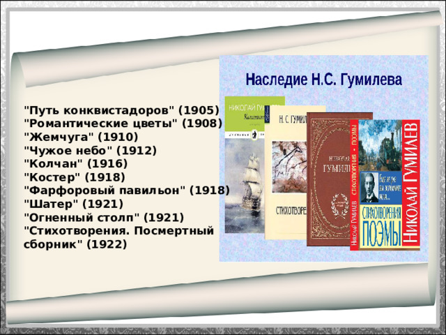 - В 1905 году выходит первый сборник Гумилева "Путь конквистадоров".
