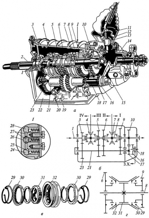 В отлитом из алюминиевого сплава картере 22 коробки передач на подшипниках установлены: первичный (ведущий) 1, вторичный (ведомый) 8 и промежуточный 21 валы. Первичный вал выполнен, как одно целое, с шестерней 3IV передачи, находящейся в постоянном зацеплении с шестерней 23 промежуточного вала, представляющего собой блок шестерен.