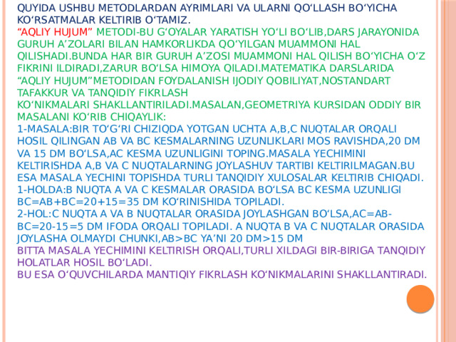 Quyida ushbu metodlardan ayrimlari va ularni qo‘llash bo‘yicha ko‘rsatmalar keltirib o‘tamiz. “Aqliy hujum” metodi-bu g‘oyalar yaratish yo‘li bo‘lib,dars jarayonida guruh a’zolari bilan hamkorlikda qo‘yilgan muammoni hal qilishadi.Bunda har bir guruh a’zosi muammoni hal qilish bo‘yicha o‘z fikrini ildiradi,zarur bo‘lsa himoya qiladi.Matematika darslarida “Aqliy hujum”metodidan foydalanish ijodiy qobiliyat,nostandart tafakkur va tanqidiy fikrlash ko‘nikmalari shakllantiriladi.Masalan,geometriya kursidan oddiy bir masalani ko‘rib chiqaylik: 1-masala:Bir to‘g‘ri chiziqda yotgan uchta A,B,C nuqtalar orqali hosil qilingan AB va BC kesmalarning uzunliklari mos ravishda,20 dm va 15 dm bo‘lsa,AC kesma uzunligini toping.Masala yechimini keltirishda A,B va C nuqtalarning joylashuv tartibi keltirilmagan.Bu esa masala yechini topishda turli tanqidiy xulosalar keltirib chiqadi. 1-holda:B nuqta A va C kesmalar orasida bo‘lsa BC kesma uzunligi BC=AB+BC=20+15=35 dm ko‘rinishida topiladi. 2-hol:C nuqta A va B nuqtalar orasida joylashgan bo‘lsa,AC=AB-BC=20-15=5 dm ifoda orqali topiladi. A nuqta B va C nuqtalar orasida joylasha olmaydi chunki,ABBC ya’ni 20 dm15 dm Bitta masala yechimini keltirish orqali,turli xildagi bir-biriga tanqidiy holatlar hosil bo‘ladi. Bu esa o‘quvchilarda mantiqiy fikrlash ko‘nikmalarini shakllantiradi.