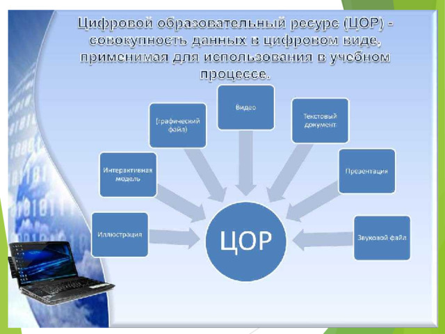 ЦОР- это учебные (образовательные) материалы, представленные в цифровой форме, необходимые для организации учебного процесса. 1.Фотографии, 2.Видеофрагменты, 3.Текстовые документы, 4.Звукозаписи, 5.Картографические материалы, 6.Статические и динамические модели, 7.Объекты виртуальной реальности и интерактивного моделирования,
