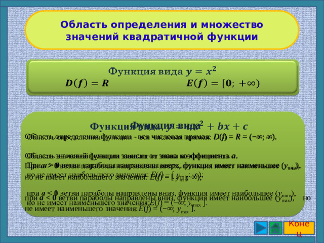 0 ветви параболы направлены вверх, функция имеет наименьшее ( y min ), но не имеет наибольшего значения: E ( f ) = [ y min ; ∞); при a ветви параболы направлены вниз, функция имеет наибольшее ( y max ), но не имеет наименьшего значения: E ( f ) = (−∞; y max ]. Конец" width="640"