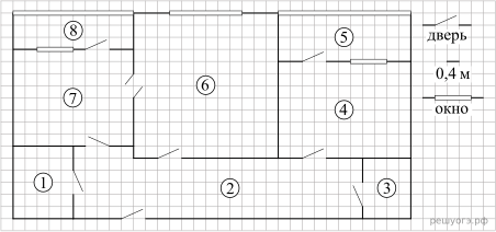 На рисунке изображен план двухкомнатной квартиры в многоэтажном жилом доме. Сторона одной клетки на плане соответствует 0,4 м, а условные обозначения двери и окна приведены в правой части рисунка.