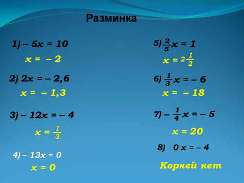 Возвращаемся к уравнениям презентации и несколько уравнений решаем предложенным способом. Ответы получаем те же, но быстрее. Мы умножали обе части на одно и то же число, не равное нулю. А нельзя ли разделить? Оказывается, можно.