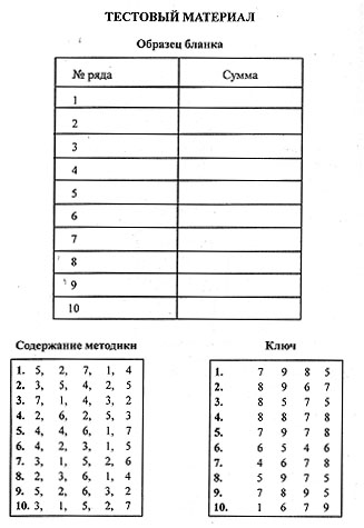 Проверка кратковременной памяти (Приложение 5) – 5 мин. Я буду зачитывать числа – 5 строк по 5 чисел в каждой. Ваше задание – запомнить эти 5 чисел в том порядке, в котором они прочитаны, а затем в уме составить первое число со вторым, второе с третьим, третье с четвертым, четвертое с пятым, а полученные четыре суммы записать в соответствующей строке бланка. Например: 6, 2, 1, 4, 2 (записывается на доске или на бумаге). Складываем 6 и 2 – получается 8 (записывается); 2 и 1 – получается 3 (записывается); 1 и 4 – получается 5 (записывается); 4 и 2 – получается 6 (записывается). Оценивается в 1 балл.