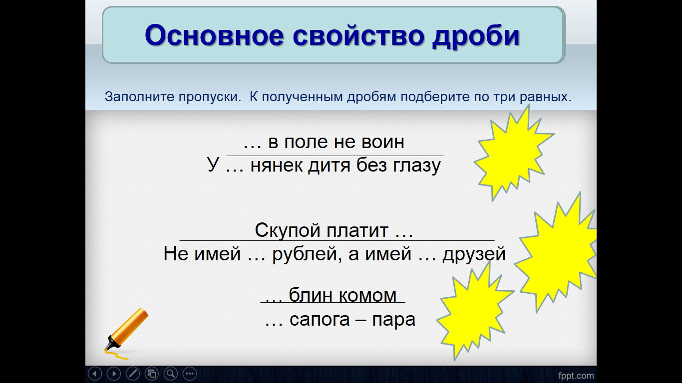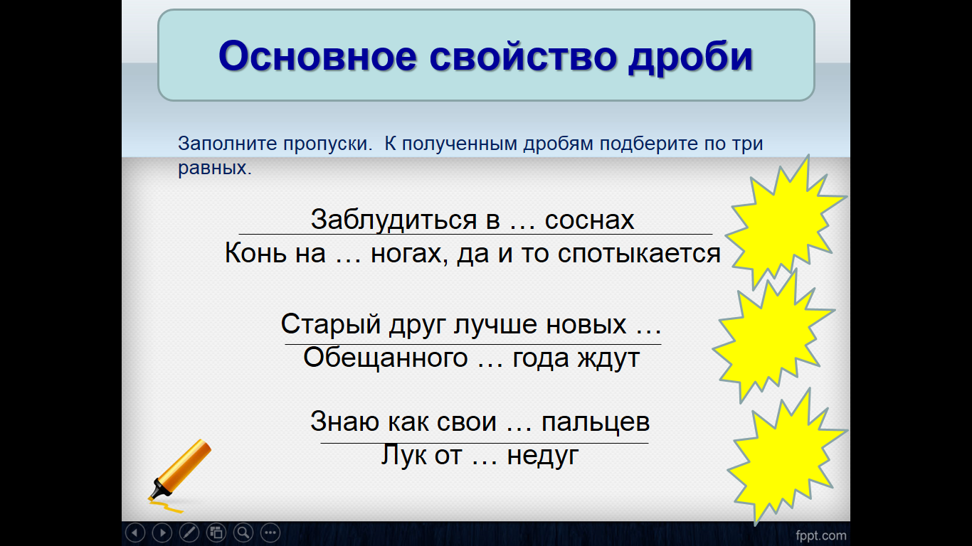 | Тип урока: | Урок повторения и закрепления знаний по теме «Обыкновенная дробь, основное свойство дроби, сокращение дробей» |