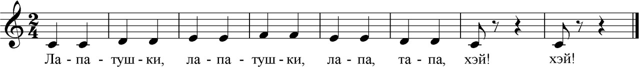 Подтекстовка этого упражнения для младшего возраста, но его с удовольствием выполняют и дети 10-12 лет. Слово «лапа» ассоциируется со словом «рука», а «тапа» - со словом «тапок», «нога». Это подсказка к движениям. На слово «ла-па» дети хлопают в ладоши, а на слово «та-па» топают ногами. Слово «хэй» - кричим ярко, звонко, вне музыкального звука, как будто зовём кого-то. Это упражнение одновременно развивает координацию движений и тренирует активное дыхание, даёт ощущение звуковой опоры.
