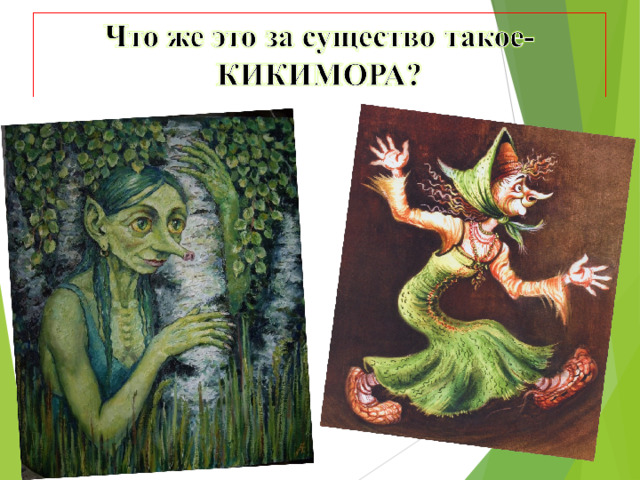Живёт, растёт Кикимора у кудесника в каменных горах. От утра до вечера тешит Кикимору Кот-Баюн, говорит сказки заморские. С вечера до бела света качают Кикимору во хрустальной колыбельке. Ровно через семь лет вырастает Кикимора. Тонёшенька, чернёшенька та Кикимора, а голова- то у неё малым-малёшенька, со наперсточек, а туловище не спознать с соломинкой. Стучит, гремит Кикимора от утра до вечера; свистит, шипит Кикимора со вечера до полуночи; со полуночи до бела света прядёт кудель конопельную, сучит пряжу пеньковую, снуёт основу шёлковую. Зло держит на уме Кикимора на весь люд честной.