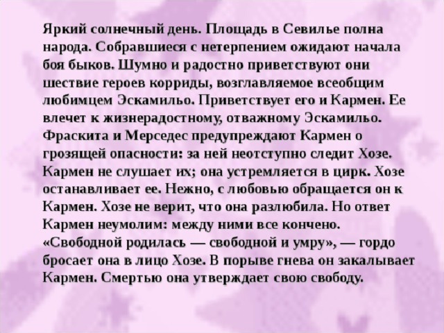 Сюжет: действие оперы разворачивается в Испании, в первой половине XIX века. Кармен – красивая, темпераментная цыганка. Но ей не нравится то, что к ней безразличен Хозе (сержант драгунского полка) , она всячески старается привлечь его внимание. Потерпев неудачу, цыганка вместе с другими девушками возвращается к работе на фабрике. Однако среди них разгорается ссора, которая мгновенно переходит в драку. Виновницей конфликта оказывается Кармен. Ее отправляют в камеру, где она томится в ожидании ордера под присмотром Хозе. Но коварная соблазнительница влюбляет сержанта в себя, и он помогает ей сбежать из-под стражи. Этот опрометчивый поступок полностью переворачивает его жизнь: Хозе теряет все – любимую девушку, семью, уважение, звание и становится простым солдатом. А все это время Кармен продолжает вести праздную жизнь – вместе с подругами она бродит по тавернам, где развлекает посетителей своими песнями и танцами. При этом девушка успевает сотрудничать с контрабандистами и флиртовать с тореадором Эскамильо. Вскоре в таверне появляется Хозе, однако совсем ненадолго – ему пора возвращаться в казарму на вечернюю проверку. Однако цыганка включает все свое обаяния, чтобы не отпустить от себя солдата. Хозе очарован ею, и приказ капитана для него теперь ничего не значит. Он становится дезертиром и отныне вынужден быть вместе с Кармен и контрабандистами. Но вскоре чувства жгучей красотки угасают – Хозе ей наскучил. Теперь она не на шутку увлеклась тореадором, который даже пообещал дать бой в ее честь. На площади в Севилье идет подготовка к бою быков. Цыганка готовится присоединиться к празднику, но на ее пути возникает Хозе. Он умоляет девушку снова быть с ним, признается в любви, угрожает, но все тщетно – она к нему холодна. В порыве гнева он достает кинжал и вонзает его в свою возлюбленную.