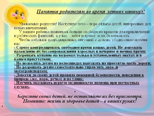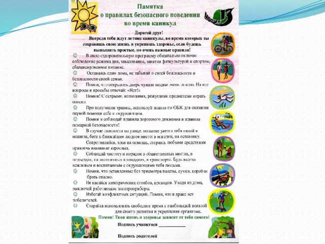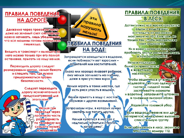 Памятка безопасного поведения для детей на каникулах, учит школьников правилам поведения на воде, на улицах, в парках, на дорогах.