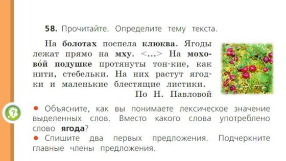 Продолжение по теме урока | - Хорошо, давайте перевернем страницу и прочитаем упр. 58. - Ребята, не случайно мы с вами в начале урока записали слово ягода. О какой ягоде говорится в тексте? - Какой общей темой связаны все предложения? - Давайте посмотрим на первое выделенное слово. Как вы понимаете его? - Хорошо, следующее слово – клюква. Что вы знаете о ней? - Далее слово – мох. Какое у него лексическое значение? - Молодцы, дальше. - Давайте запишем первые 2 предложения. Вызываю учеников к доске. - Найдем грамматическую основу предложения и подчеркнем ее. Та же работа со вторым предложением. | О клюкве Ягоды или Клюква Болото - очень мокрое место на земле, где много воды, кочек и влаголюбивых растений, таких как камыш и мох Клюква - кислая, красная ягода, которая растет на болотах. Мох - маленькое, древнее растение, которое растет на влажных камнях, деревьях и земле в лесу или рядом с водоемами. Моховая подушка — небольшое мягкое возвышение из мха на болотах. Записывают (что?) клюква – подлежащее, подчеркивает 1 чертой Клюква (что сделала?) поспела – сказуемое, 2 чертами | |