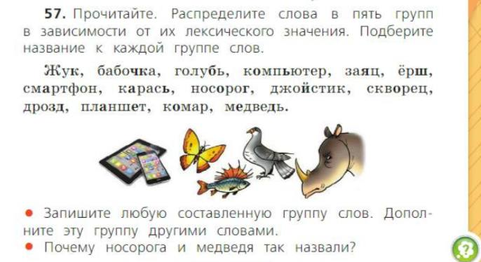Работа с учебником | - Ребята, посмотрите на упр. 57 на стр. 45 - Что вам нужно сделать в этом упражнении? - Кто уже догадался, какую группу можно выделить? - На доске записываются названия групп: Насекомые, птицы, гаджеты, звери, рыбы Каждая группа слов озвучивается - Ребята, скажите, а почему носорога так назвали? А медведя? - Молодцы! Давайте запишем группу только с птицами. - Ребята, а каких птиц вы еще знаете? Запишите себе еще один понравившийся пример. - Скажите, в зависимости от значений слова, что мы сделали со словами? | Читают Разделить слова на 5 групп. Отвечают по руке Выписывают: голубь, скворец, дрозд Синица, воробей, ласточка… Читают Потому что у него на носу есть рог Потому что он ведает (знает), где есть мед Разделили на группы | |