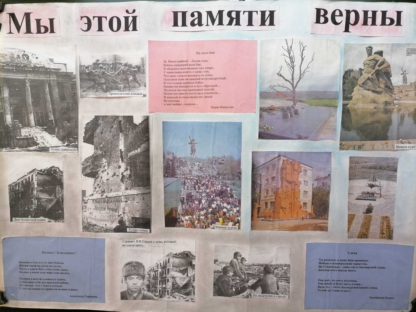 Плакат «Ни кто не забыт, ничто не забыто», аудиозаписи песен о войне, выставка книг, поделок, рисунков о Сталинградской битве, презентация «Мы этой памяти верны»