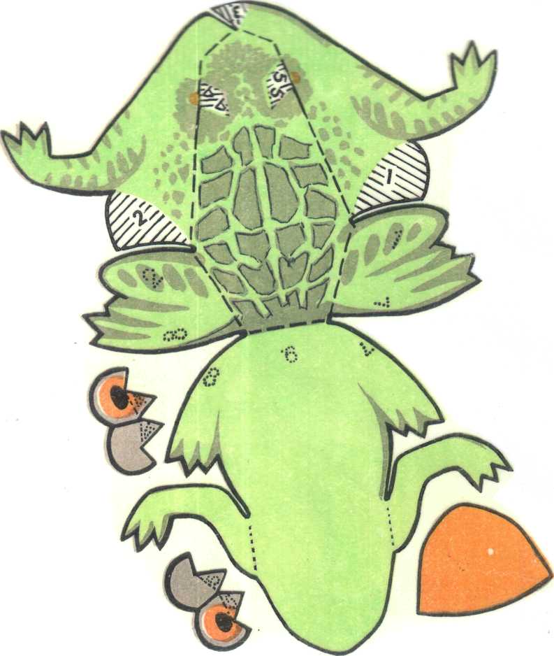 Собираем лягушку (склеиваем) по номерам. В коробочку под номером 9 кладем пластилин, склеиваем её. Коробочку вклеиваем в лягушку в место под номером 9.