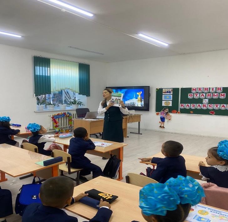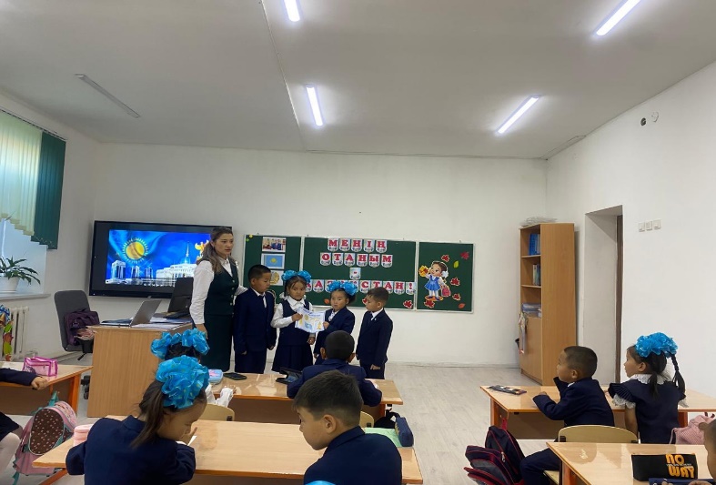 Басы | 1-жүргізуші: Айзере Ұстаз - ұлағатты есім. Күн сәулесі өмірге қандай жарық берсе, ұстаз есімі де шәкірттерге күндей жарық береді. Ақырын жүріп анық бас. Еңбегің кетпес далаға Ұстаздық еткен жалықпас, Үйретуден балаға, – деп Абай атамыз айтқандай, ұстаздар қауымы шәкірттерінің өзінен озғанын қалайды. Мұғалім: Сонымен «Ұстаз--ұлы тұлға!» атты тәрбие сағатымызды ашық деп, кезекті оқушыларға береміз. Балалардың бағы болып басты әні, Ұстаз елді болашаққа бастады. Нұрын шашып ұстаздықтың дастаны, Ашық болсын туған елдің аспаны. Аспандағы жұлдыздардай жанды үміт, Арайлап ата берсін таң күліп. Жақсы ойлары жүректерді жаңғыртып, Ұстаз ісі жасай берсін мәңгілік. Мұғалім деген-ерекше тұлға дара шың, Ұмытылмастай өмірде мәңгі қалатын. Мұғалім деген –аяулы адам асыл жан, Шәкірт көңіліне күй болып жайнап жанатын. Жадыраған жаздай жылы жаны бар, Жақсылықтың шырағы болып жағылар. Қадірлі ұстаз гүлмен бірге жолдаған, Шәкірттеріңнің жүрек сөзін қабыл ал. Әр жүйенің еңбекте тірегісің, Тәрбиенің мектепте жүрегісің. Жасыл баққа сән берген бағбандай-ақ, Жас ұрпаққа үлгі боп жүрер ісің. Мұғалім: Бұл санда қанша әріп бар болса, сонша сан бар. Ол қай сан? Жел соққанда тау ық бола ма? Теңізде қандай тас болмайды? Ертістің ортасында не бар? Үйретіп өмір ұстазым, Үлгілі іске нұсқадың. Ақкөңіл, іскер қашан да, Ақылшым –менің ұстазым! | Оқушылар орындарынан тұрады II жүргізуші: Әділжан Ұстаз! Осы бір сөздің өзінде қаншама мән-мағына ,қасиетті ұғым жатыр.Ұстаз алдынан өтпейтін ешкім жоқ. «Жақсы мұғалім—мектептің жүрегі»-- деген Ы.Алтынсарин атамыз.Жүрексіз өмір болмаса ,мұғалімсіз білімнің,тәрбиенің іске аспайтыны белгілі.Небір данышпан адамдар,қарапайым еңбеккерлер,тіпті арман қуған жеткіншектер де бәрі бір адамға қарыздар.Ол-ұстаз!Ұстазсыз өмірдің нақты тұтқасын ұстау мүмкін емес.Адамды тәрбиелеп,оны азамат етудің өзі бір үлкен күш,сондықтанда ұстаздың еңбегі -- ұлы еңбек. Қуаныш: Ғылым иесі ғалым да,ел қорғаған батыр да,тілінен бал тамған ақын да, мал бағып терін төккен шопан да,ғарышкерде бәрі-бәрі ұстаздан тәлім- тәрбие алған. Әдетте оқушының бойына білім-білік дағдыларын дарытып,зердесіне ғылым негіздерін тоқитын,алған білімдерін өмірде қолдана білуге үйрететін—ұстаз. | Өлеңдер Плакаттар Түрлі- түсті қарандаштар |