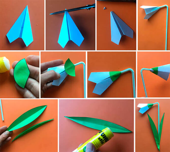 Вырезаем длинные листики, для одного цветка нам нужно два зелёных листика, полукруглое основание цветка, для самого цветка нам нужен прямоугольник. Можно брать любой цвет бумаги, но лучше белый, так как подснежники белого цвета. Слаживаем прямоугольник как самолётик и обрезаем носик. Обрезанным носиком приклеиваем к коктейльной трубочке, приклеенный носик закрываем полукругом. Снизу трубочки клеим наши листики.