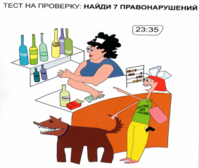 1. продажа алкоголя и сигарет несовершеннолетнему лицу, 2. продажа алкоголя в ночное время, 3. ношение оружия лицом, не имеющим соответствующего права, 4. вход в продуктовый магазин с собакой, 5. собаку ведут в общественном месте без намордника и поводка, 6. отсутствует касс.