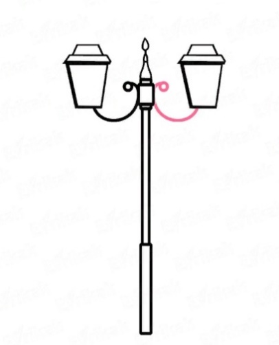 | Анализ образца изделия. План работы. | 5 мин | - На доске представлен образец уличного фонаря. На слайде представлено поэтапное рисование. Давайте обсудим, с чего мы начнем. 1. Каркас. Проведите две вертикальные линии. Они должны находиться очень близко. Затем соедините их сверху и снизу. 2. Нижняя опора. Чтобы фонарь не упал, его нижнюю часть нужно сделать немного шире. 3. Пластина для крепления. Благодаря пластине фонари крепятся к каркасу. Также здесь происходит соединение проводов, которые проводят электричество. Выглядит эта деталь как маленькая батарейка. 4. Верхушка. Верхнюю часть фонарю можно украсить красивыми железными деталями. 5. Фонари. Сами светильники изобразите в виде небольших цветочных горшков. После сверху на светильниках нарисуйте «шляпки», которые защищают лампы от дождя и непогоды. 6. Соединение. Соедините светильники с пластиной. Крепление должно быть одинаковым. 7. Украшение. Не забудьте украсить фонарь изогнутыми деталями. Это могут быть маленькие цветы или листики. 8. Раскрашиваем. Каждую деталь можно раскрасить в отдельный оттенок. Фонари сделайте желтыми. (Слайд 6) | Обсуждают с учителем поэтапное рисование. | Демонстрация, беседа. |