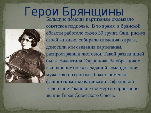 Большую помощь партизанам оказывало советское подполье. В то время в брянской области работало около 30 групп. Они, рискуя своей жизнью, собирали сведения о враге, доносили эти сведения партизанам, распространяли листовки. Такой разведчицей была Валентина Софронова. За образцовое выполнение боевых заданий командования, мужество и героизм в боях с немецко-фашистскими захватчиками Сафроновой Валентине Ивановне посмертно присвоено звание Героя Советского Союза.
