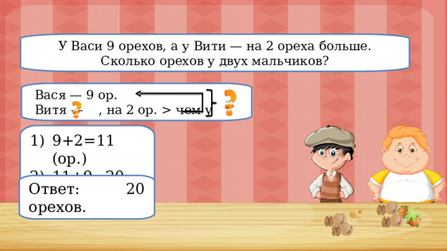 У Васи 9 орехов, а у Вити — на 2 ореха больше. Сколько орехов у двух мальчиков?