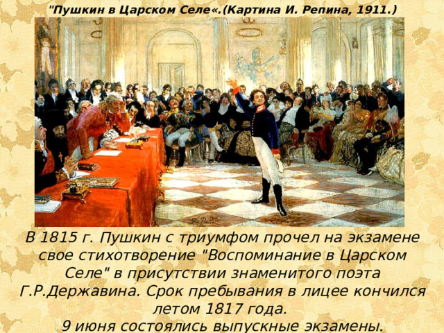 В 1815 г. Пушкин с триумфом прочел на экзамене свое стихотворение "Воспоминание в Царском Селе" в присутствии знаменитого поэта Г.Р.Державина. Срок пребывания в лицее кончился летом 1817 года.