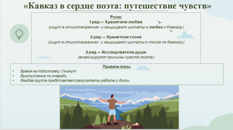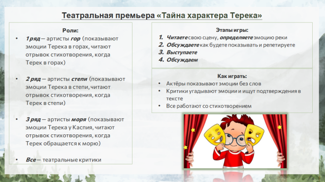 | Ролевая игра: ««Азбука общения» - Действительно, ребята, важно уметь правильно общаться и уважать чувства других людей, и сейчас закрепим эти знания с помощью интересной ролевой игры, которая называется «Азбука общения Мы разделимся на 3 группы по рядам. Я раздам каждой группе карточку с заданиями. В этих карточках вы найдёте отрывок текста из произведения и три важных части задания: первое - нужно показать сцену из произведения, распределив между собой роли и изобразив то, что описано в тексте, второе - придумать, как можно было бы решить эту ситуацию по-другому, более правильно, уважая чувства всех героев, и третье - ответить на вопросы для размышления, которые помогут лучше понять ситуацию. -Каждая группа должна распределить кто и что делает. Некоторые ребята будут актёрами и покажут сценку, а другие будут аналитиками - они будут отвечать на вопросы, а оставшиеся ребята станут разработчиками и будут думать над альтернативным решением. - На подготовку вам дается 5 минут, после чего мы начнем наше выступление и превратимся в героев повести! - Всем понятно задание? - Тогда давайте распределим сцены. (Распределяет карточки по рядам) - Время пошло. Начинайте подготовку. - Итак, первая группа, давайте посмотрим, как вы справились с заданием. (Проверяет выступление актеров) - Молодцы, ребята. Как вы предложили решить ситуацию по-другому? - Отлично, а теперь проверим вопросы: Почему Серёжа решил скрыть свою боль? Почему важно не прятать свои чувства? Как можно было поддержать Серёжу? - Хорошо. Похлопаем первой группе. Садитесь, ребята. - Переходим ко второй группе. Выходите, актеры. Начинайте свое выступление. (Проверяет выступление актеров) - Отлично. А теперь покажите, как могла бы развиваться ситуация, если бы дети проявили уважение к решению Иленьки. -Хорошо. А теперь давайте ответим на вопросы в вашей карточке: Почему Иленька чувствовал себя неуверенно? Какие эмоции испытывал Иленька? Как правильно реагировать на отказ другого человека? - Молодцы. Похлопаем второй группе. Садитесь. - Третья группа, ваша очередь.Выходите на сцену. - Начинайте выступление. (Проверяет выступление актеров) - Молодцы. А теперь покажите, как могла бы развиваться ситуация, если бы дети не стали издеваться над Иленькой, заставляя делать его стойку на руках. - Хорошо, ответим на вопросы: Почему важно уважать чувства других людей? Какие чувства испытывал Иленька во время издевательств? Почему? Как можно было защитить Иленьку и его достоинство?» Карточки для игры: Группа 1: Сцена «Травма Серёжи» Ситуация для показа: Серёжа играет в разбойники и сильно ударяется коленом о дерево. Несмотря на боль, он решает не показывать свои чувства и продолжает игру. Задания для группы: 1 задание «Покажи сцену»: Изобразить как Серёжа ударяется и испытывает боль Изобразить, как Серёжа скрывает свои чувства и продолжает игру Роли: Автор (Читает текст отрывка с выражением) Николенька (Показывает сцену и говорит свои реплики) Серёжа (Показывает сцену и говорит свои реплики) Володя Старший Ивин Текст из произведения для показа сценки: Автор: В палисаднике было очень весело. Игра в разбойники шла как нельзя лучше; Но тут Сережа споткнулся и на всем бегу ударился коленом о дерево, так сильно, что я думал, он расшибется вдребезги. Я подошел и стал спрашивать: Николенька: Серёжа, тебе больно? Ты сильно у