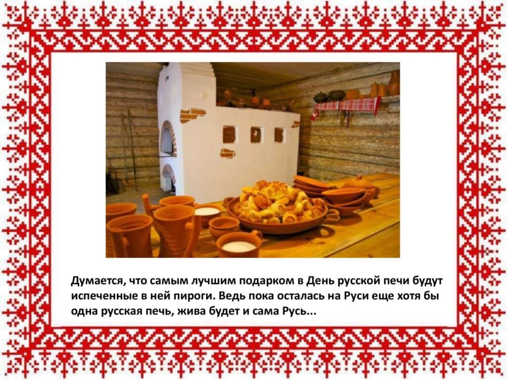 Думается, что самым лучшим подарком в День русской печи будут испеченные в ней пироги. Ведь пока осталась на Руси еще хотя бы одна русская печь, жива будет и сама Русь…