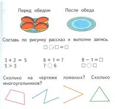 – Рассмотрите картинку к задаче. – Сколько было клубничек на 1 тарелке? – Сколько на второй? – Как это записать с помощью цифры? – Какое равенство подходит к картинкам.