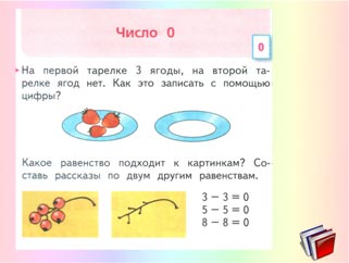 В математике есть число, которое заменяет «нисколько» – это число 0. – Как вы думаете, чему мы сегодня будем учиться на уроке? (Знакомиться с новым числом, учиться писать новую цифру, работать с иллюстрациями учебника, работать в тетради). – Давайте, ребята, наметим план действий. 1. Сами попробуем выполнить задание: узнать, как получить число 0 2. Сопоставим свои предположения с учебником, спросим у учителя. 3. Устраним затруднение. 4. Применим новое знание. 5. Определим в конце урока, чего я достиг?
