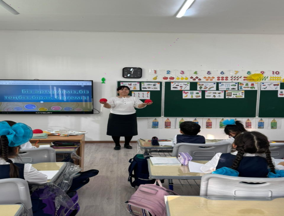 | І. Ұйымдастыру кезеңі Сәлемдесу, оқушыларды сабаққа даярлау. Адам — бұл бір тұтас әлем, егер ғаламды түсінгің келсе, алдымен өзіңді таны. Абай Құнанбайұлы «Айырмашылықты сезіну» ойыны (когнитивті, эмоционалды, физикалық және әлеуметтік дағдыларды дамытуға арналған жаттығу). Оқушыларға үстелде тұрған тосынсыйлар қорабына назар аудару ұсынылады. Мұғалім үш оқушыны шақырып, қорапқа қолдарын салып, ішінде не жатқанын қолдарын қораптан шығармай анықтап табуды сұрайды. (Қорапта алма, картоп, анар бар). Мұғалім балаларға осы заттардың арасында не ортақ екенін және оларды бір-бірінен қалайша ерекшелендіретінін анықтауға тапсырма береді. Оқушылар дың жауаптарын кестеге жазу керек. Мысалы: | Картоп, алма,анар | | | | Ұқсастығы неде? | Айырмашылығы қандай? | | | | Пішіні дөңгелек. Қабығы, мәйегі бар. Барлығы жеуге жарамды. Денсаулыққа пайдалы (құрамында дәрумендер бар). | Пішін ерекшеліктері (картоп сопақша, анардың құйрығы бар, алманың таяқшасы бар). Әр түрлі өсу орны (картоп – жердің астында, анар мен алма - ағашта). Әр түрлі топтарға жатады (картоп - көкөніс, алма және анар - жемістер) Дәмдері әртүрлі. Түстері әртүрлі. Олардың құрамында әртүрлі дәрумендер бар | | | Талқылауға арналған сұрақтар Айырмашылығы қандай? Пішін ерекшеліктері (картоп сопақша, анардың құйрығы бар, алманың таяқшасы бар) Әр түрлі өсу орны (картоп – жердің астында, анар мен алма - ағашта). Әр түрлі топтарға жатады (картоп - көкөніс, алма және анар - жемістер). Дәмдері әртүрлі. Түстері әртүрлі. Олардың құрамында әртүрлі дәрумендер бар. Бірдей, бірақ сонымен қатар айырмашылықтары да бар заттарды тағы қалай атауға болады? (тамақ, сусындар, киім және т.б.) -Адамдар туралы, сен және біз туралы дәл солай айта аламыз ба? -Сен және біздің ортақ қасиеттеріміз бен айырмашылықтарымыз көп пе? 2. Әрі қарай мұғалім сыныпты екі топқа бөліп, бетпе бет тұрып, екі шеңберге - ішкі және сыртқы болып бөлінеді. Екі шеңбердегі қатысушылардың саны бірдей. Сыртқы шеңбердің қатысушылары қарама-қарсы серіктестеріне: «Біз екеуміздің ұқсастығымыз...» деген сөзден басталатын сөйлемді айтады. Мысалы: «Біз жер планетасында өмір сүріп жатырмыз, біз бір сыныпта оқимыз» және т. б. Ішкі шең бердің қатысушылары: «Сен және біздің айырмашылығымыз...». Мысалы: «Біздің көздеріміздің түсі әртүрлі, шашымыздың ұзындығы да әртүрлі» және т.б. Содан кейін жүргізушінің бұйрығымен ішкі шеңбердің қатысушылары серіктесін ауы стырып, (сағат тілімен) қозғалады. Бұл рәсім ішкі шеңбердің әрбір қатысушысы сыртқы шеңбердің әрбір қатысушысымен кездескенше дейін қайталанады. Осылайша, сыныптастар бір-бірімен жақынырақ танысады: олар бір-біріне қа лай ұқсас, немен ерекшеленеді, кімнің мүдделері мен әдеттері ортақ және т.б. айырмашылықтары белгілі болады. Осы жаттығу орындалғаннан кейін оқушыларға сұрақтарға жауап беру ұсынылады. • Жаттығу кезінде қандай сезімде болдың? • Басқалар туралы (қызықты, таңқаларлық) не білдің? 3. Мұғалім барлық оқушыларды еденде бормен алдын-ала белгіленген сы зықтан тыс тұруға шақырады және оның әлеуметтік құзыреттілігін сипаттайтын белгілі бір жеке қасиеттерді атайды. Оларға не сәйкес келетінін естігеннен кей ін, балалар мұғалім еденге бормен салған басқа сызыққа көшеді. (Ойынның бұл бөлігінде қол шапалақтауды қолдануға болады. Мысалы, оқушылар сыныптаста рына, аталған сипаттамаларға сәйкес келгенде қо