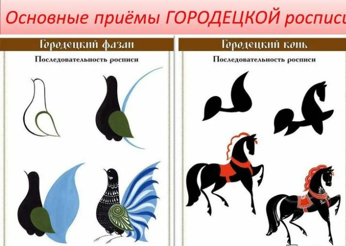 Каждый этап работы над узорами Городца носит определённое своеобразие в технике выполнения: