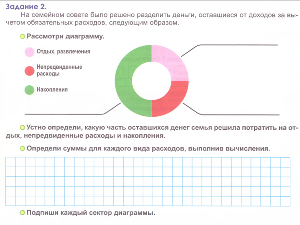 - На семейном совете семьи Ивановых было решено разделить деньги, оставшихся от доходов за вычетом обязательных расходов, следующим образом. (Задание из тетради)