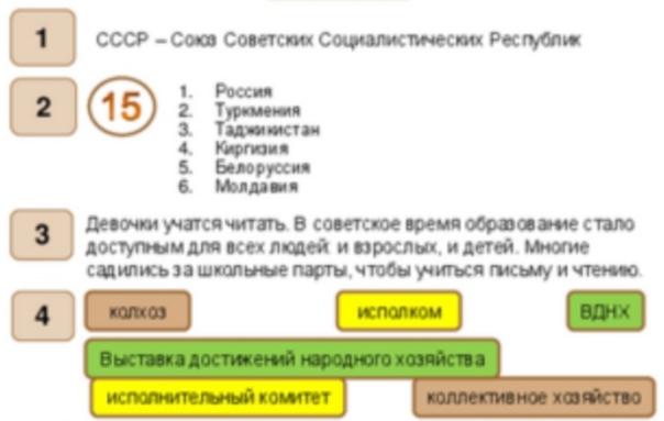 Работа по теме урока | - Теперь жизнью страны руководила партия большевиков, завоевавшая свою власть в Гражданской войне. Позднее большевиков стали называть коммунистами. Государством управляли Советы – правительство большевиков, поэтому и новую власть стали называть Советской. В высшей степени ослабленной вышла Советская республика из пожарища Гражданской войны. Страна была в полной разрухе. Не работали заводы и фабрики. Стоял транспорт. Не было топлива. Лишившиеся погибших на фронтах войны отцов и умерших от голода и лишений матерей, дети стали беспризорными, нищенствовали и попрошайничали. Российские крестьяне оказались без рабочего скота и были вынуждены проводить весенний сев, сами впрягаясь в плуги. Не только город, но и деревня голодали. Большевистское правительство было вынуждено силой забирать у крестьян все те очень маленькие запасы зерна, которые хранились для посева. Холодная зима и засушливое лето стали причинами неурожая, который в 1921 году постиг всю страну. Разразился невиданный голод. Казалось, никогда уже Россия не сможет встать на ноги. Но постепенно жизнь все же начала налаживаться. Большевистское правительство было вынуждено продать за границу много золота и других драгоценностей, для того чтобы на полученные деньги закупить зерно для голодающей России. Постепенно стали восстанавливаться заводы и фабрики, разрушенные войной. Наконец заработали железные дороги. - В 1922 году на территории бывшей Российской империи появилось новое государство – Союз Советских Социалистических Республик или СССР. Вошли в это гос-во 15 республик. - Ребята, давайте прочитаем на слайде, какие республики входили в состав СССР. - У этого нового гос-ва был новый герб. Давайте с вами более детально рассмотрим герб СССР. - Ребята, перечислите из каких элементов состоит герб? - Каждая деталь государственного герба Советского Союза изображена не просто так, ведь смысл есть во всем. Серп и молот воплощают в себе союз рабочих, крестьян и интеллигенции, борющихся за светлое будущее. - Сколько ленточек перевивают колосья пшеницы? Ленты же отображали число республик, входивших в состав СССР. Земной шар означал, что все страны мира могли присоединиться к Советскому союзу. - Красная звезда обозначала освобождение трудящихся от голода, холода, войны, нищеты и рабства. Восходящее солнце – символ возникновения СССР, строящего коммунистическое общество. Некоторые расшифровывают солнце с лучами как зарождение коммунистических идей. - Столицей страны стала Москва. Для того, чтобы с новым государством начали считаться соседние страны, оно должно было стать сильным и хорошо защищенным, со многими заводами и фабриками, электростанциями, хорошо работающими железными дорогами и речными и морскими путями. Для защиты страны нужны были большая и хорошо вооруженная армия и флот. Но нужны были и грамотные инженеры, учителя, агрономы, ученые. Необходимо было ликвидировать неграмотность, так как в наследство от царской России новой власти досталось почти неграмотное население – мало кто умел читать и писать. - Над школьными тетрадками склонились взрослые. Миллионы людей сели за парты. Образование стало доступно всем. - Но в то же время отечественная культура понесла большие потери. Были варварски уничтожены многие исторические памятники. В Москве бы