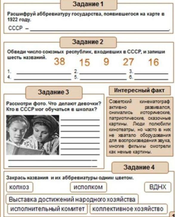 | 6.Подведение итогов | - Итак, наш урок подходит к концу, давайте подведём итоги. - С каким периодом советской истории мы сегодня познакомились? - Какие важные события произошли в стране в 1920-1930 гг.? - Сколько республик входило в состав СССР? - Отлично. Какие цели мы ставили на уроке? - Достигли ли мы поставленных целей? | - «Страницы истории 1920-1930 годов». - В 1922 году появилось новое гос-во - СССР, в 1930-е годы СССР напоминал гигантскую стройку. - 15 - Мы ставили цели познакомиться с новым государством – Советским Союзом, узнать, какие события произошли в это время. - Познакомиться с жизнью нашей страны в 20–30-е годы, научились находить столицы СССР на карте. - Да | Коммуникативные: знаково-символические средства, направленные на приобретение умения адекватно передавать информацию и отображать предметное содержание и условия дея-ти и речи. Регулятивные: знаково-символические средства, включающие способность принимать и сохранять учебную цель и задачу, контролировать и оценивать свои действия. |
